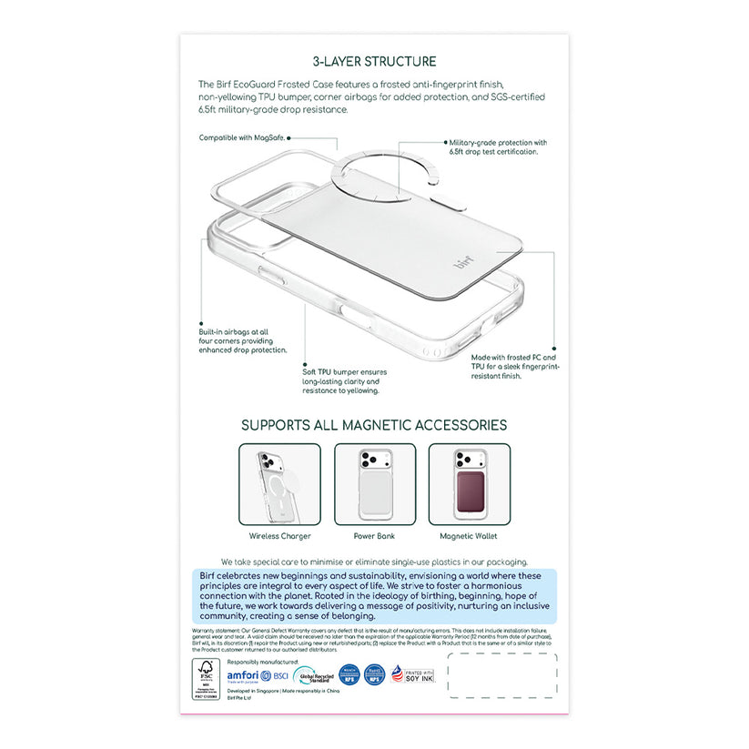Birf EcoGuard Frosted Case features a frosted anti-fingerprint finish, non-yellowing TPU bumper, corner airbags for added protection, and SGS-certified 6.5ft military-grade drop resistance.