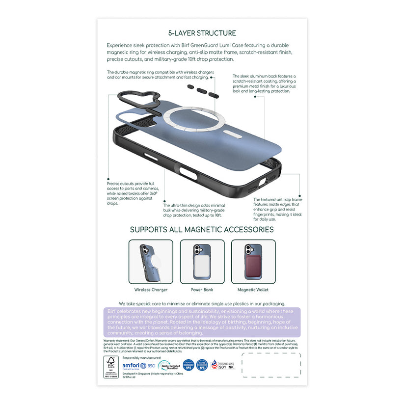 Experience sleek protection with Birf GreenGuard Lumi Case featuring a durable magnetic ring for wireless charging, anti-slip matte frame, scratch-resistant finish, precise cutouts, and military-grade 10ft drop protection.