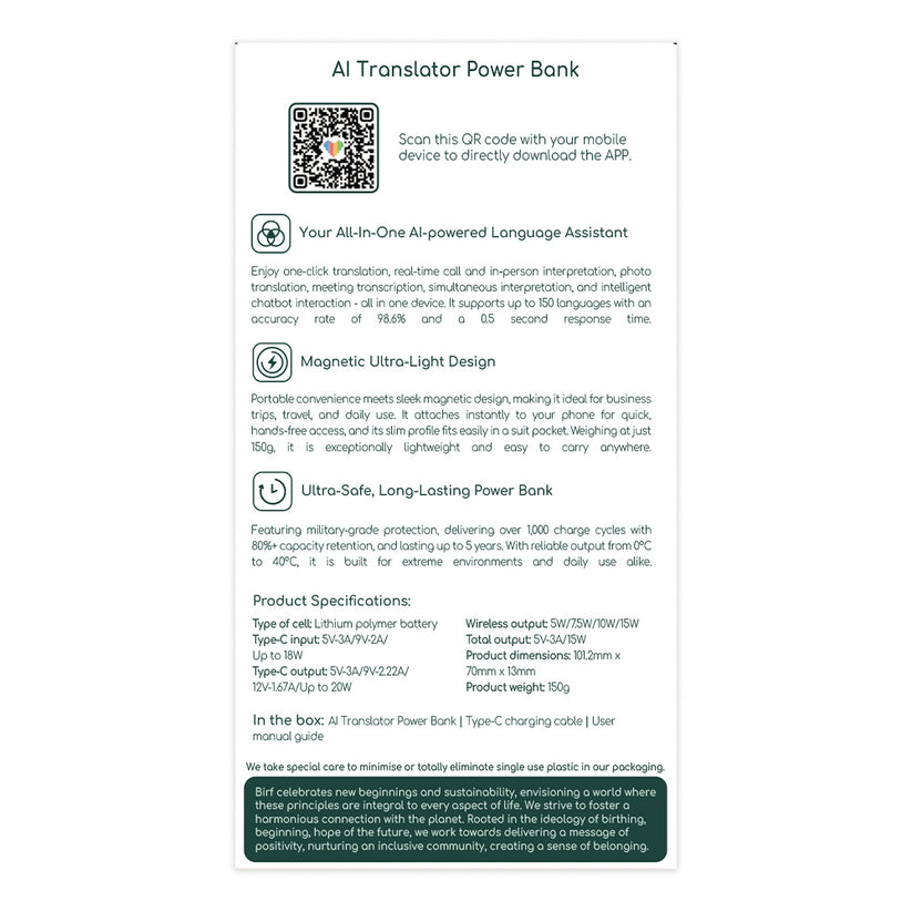 Travel smarter with the Birf AI Translator Power Bank, your all-in-one charging and communication essential. It’s not just a power bank, it’s a real-time AI translator in your pocket.