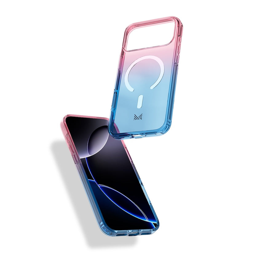 The Monocozzi ESSENTIALS Hybrid Case for iPhone 17 provides strong shockproof protection with a stylish transparent Pink/Blue color design. Dual-layer construction safeguards against drops and scratches while maintaining full magnetic wireless charging compatibility. Easy access to buttons, ports, and cameras ensures seamless daily use.