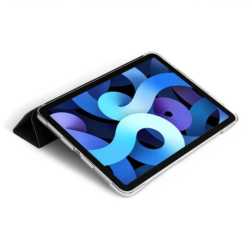 Our Power Support Air Jacket Folio Transparent Case for iPad Air Series just got an upgrade with the stylish and protective cover by Amos. The solid black polycarbonate case is thin and strong, with a stylish fabric like texture. Our exact cutout design ensures that the camera, buttons, and ports are protected and accessible. The fashionable AMOS fabric-like textile cover protects the screen with an ultra-fine fiber cloth lining and a matte-finish polycarbonate outside casing. A special pocket built into the Air Jacket holds the Apple Pencil in place. Need to take a photo when the cover is over the camera? Don’t worry, the quick camera access corner flips out of the way so you can capture wonderful images at any time. The cover can be folded to prop-up the iPad Air Series in either the horizontal or vertical position providing multiple ergonomic viewing options.